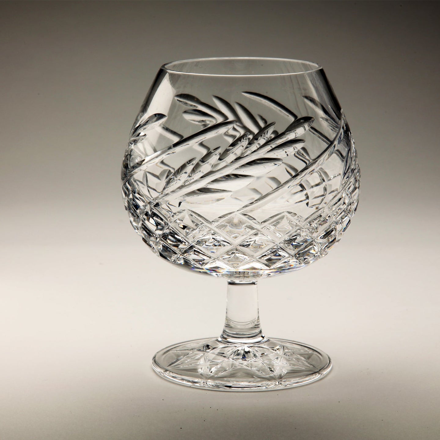 Crystal brandy glass with Wheat design and our signature, Irish Rose motif on the base.